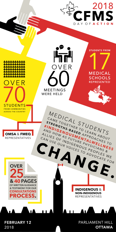 Chaque année, des étudiants en médecine de partout au Canada se rendent à Ottawa pour rencontrer des parlementaires et proposer un changement positif au notre système de santé. En prévision des réunions, cet événement comprend une formation poussée sur le plaidoyer. C'est une excellente occasion pour les étudiants en médecine qui s'intéressent à la promotion de la santé nationale. La Journée d'action ne serait pas possible sans notre équipe dévouée d'étudiants au Comité de recherche de la Journée d'action qui réunit le document de demande, le document d'information et coordonne le processus de consultation.