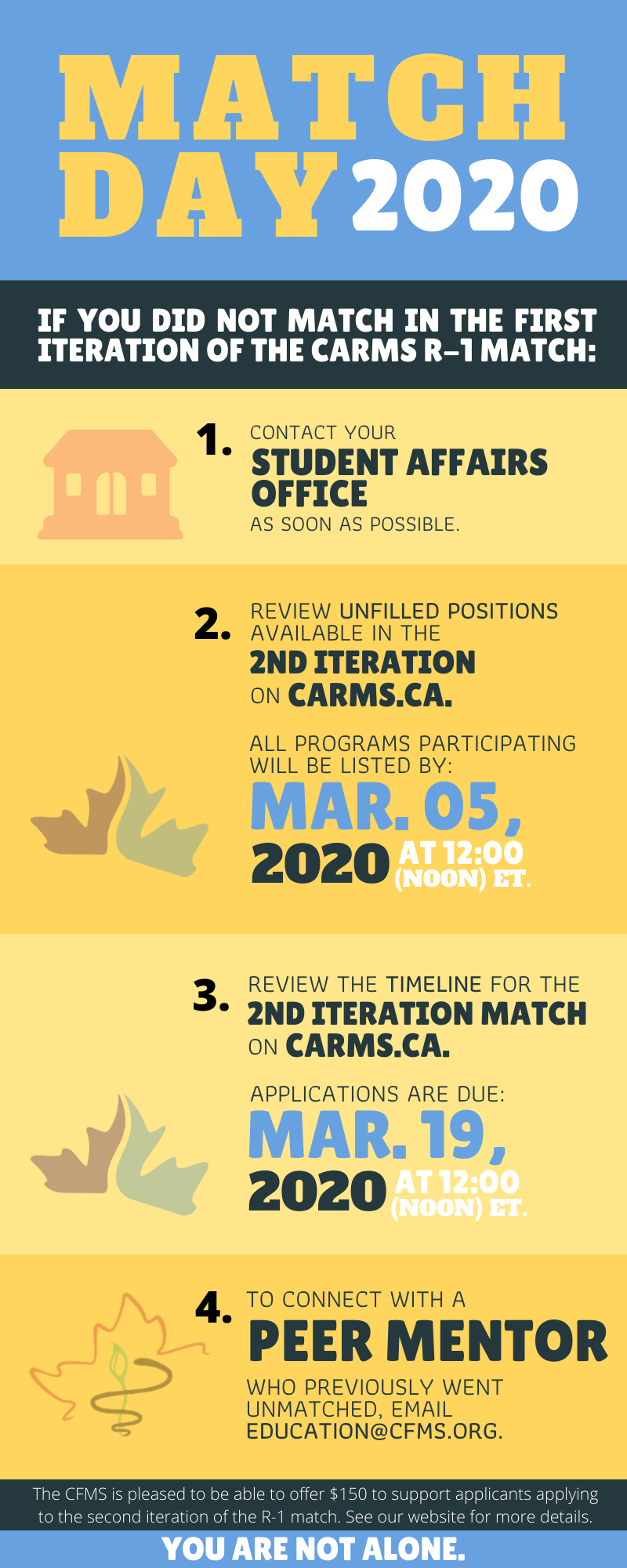 If you did not match and are a CFMS member, we have listed some steps for you to consider. Your Student Affairs and Undergraduate Medical Education offices have been made aware of these supports as well: