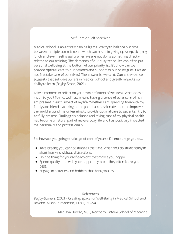 With all that we have to complete in medical school, it can feel like there are not enough hours in the day to study let alone dedicate to other commitments. We can even feel guilty when we step away to take some personal time. But being able to find that balance is vital to help prevent burn out and maintain overall wellness. Proactively taking small steps in our everyday lives can help us succeed in school while also having a “life” outside of it.