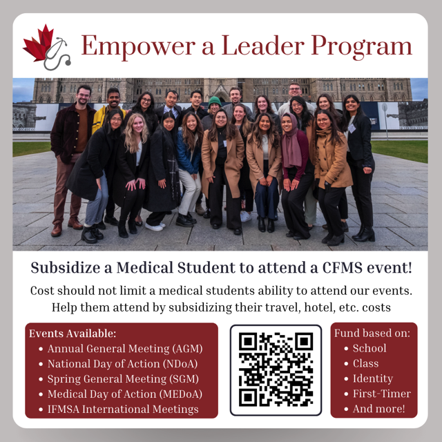 As part of the CFMS’s global strategy to make our in-person events more accessible by lower the cost of attending AND as part of our EDI strategy to ensure equity-deserving groups are empowered in the CFMS, we are proud to present the CFMS Empower a Leader Program!